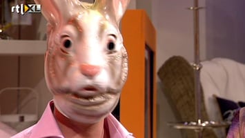 Rudolph van Veen moet geblinddoekt verschillende producten kiezen en hier dan iets van proberen te maken...Hij is letterlijk, het haasje...