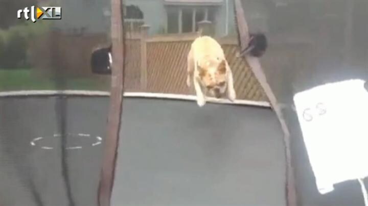 Deze hond vermaakt zich prima op de trampoline. Hij laat heel wat knappe sprongen zien.