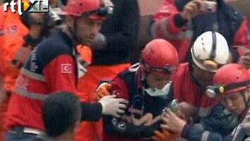 Een wonder noemen de reddingswerkers het. Diep onder het puin lag een baby van twee weken oud. Reddingswerkers filmden de redding. Het kind is gezond.