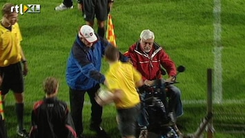 Een bejaarde man die vrijdagavond met zijn scootmobiel na een duel in de Jupiler League een scheidsrechter aanreed, krijgt een landelijk stadionverbod.
